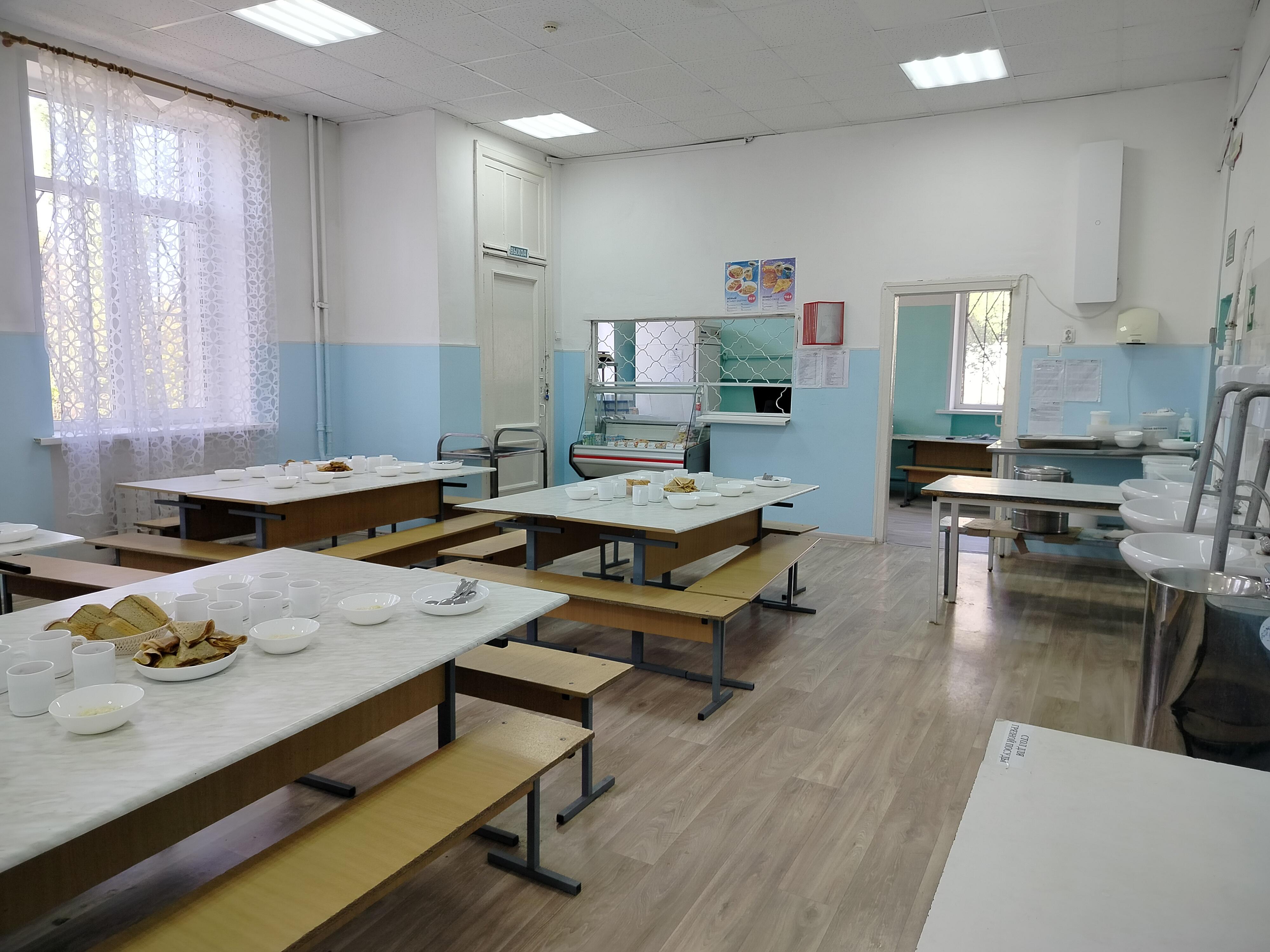 Собственной (или на условиях договора пользования) столовой не имеется. Современного технологического оборудования в столовой не имеется из-за отсутствия столовой. Имеется буфет-раздаточная (с современным технологическим оборудованием) с обеденным залом на 60 мест, учащиеся обеспечиваются горячим питанием как за счёт бюджета Волгоградской области и Волгограда, так и за счёт родительских средств. Обеспечивается питание детей с ограниченными возможностями здоровья, детей инвалидов. Современно оформленный зал для приема пищи обеспечен в соответствии с требованиями СанПиН (на 60 места имеются 12 столов, 24 скамьи, 3 мойки, 1 сушилка, над каждой мойкой расположены диспенсеры с жидким мылом и бумажные полотенца).